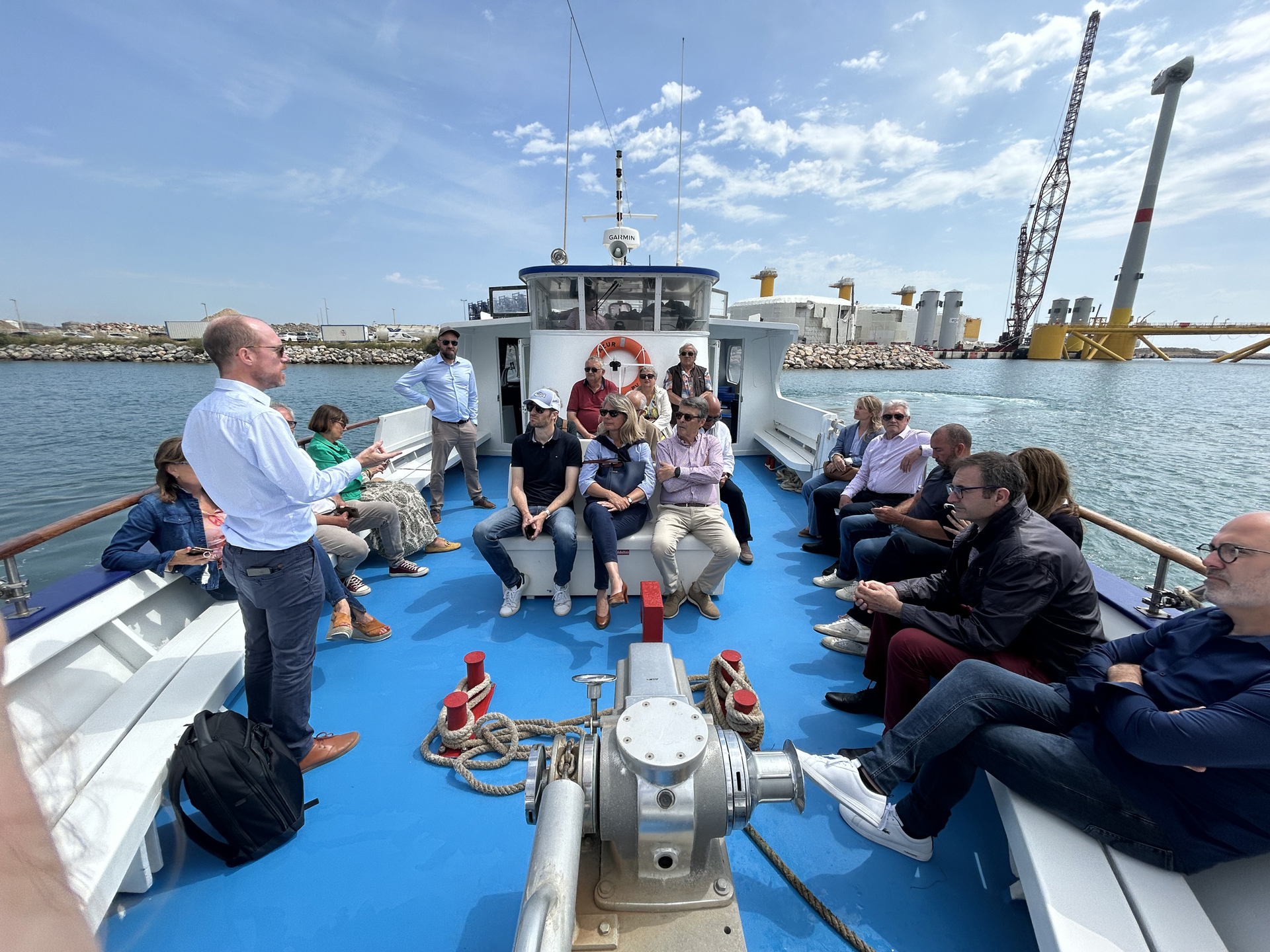 Le projet EFLO a participé à la journée d’accueil du public organisée le 25 juin 2025 au port de Port-La Nouvelle par les services de l’Etat en région (DREAL). L’objectif était de sensibiliser les participants au développement de l’éolien flottant en Méditerranée, d’observer les éoliennes flottantes du projet pilote EFGL en cours d’assemblage à Port-La Nouvelle et d’échanger avec les équipes des enjeux techniques, environnementaux et énergétiques avec les équipes en charge des projets EFGL et EFLO.