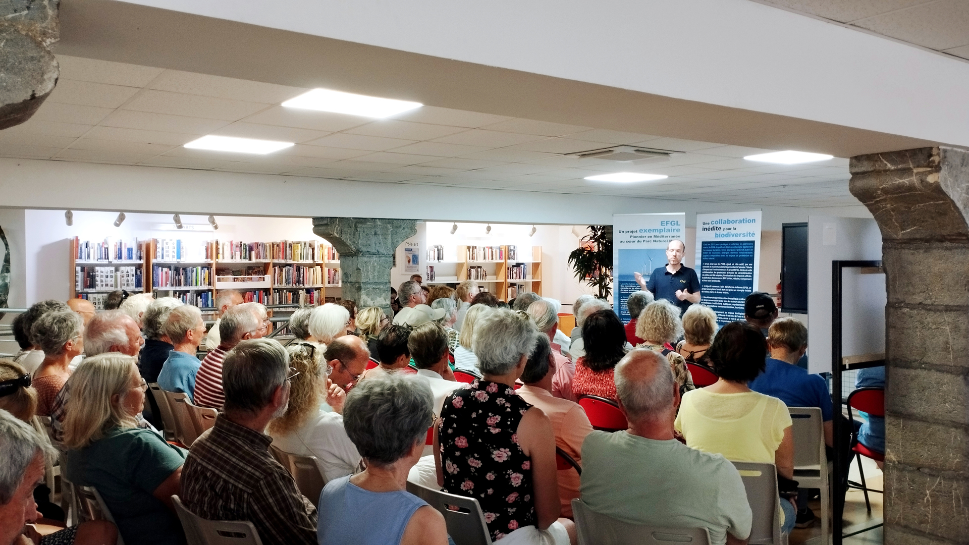 Les 17 et 24 juin 2025, deux conférences ont été organisées à la Médiathèque Georges-Duret de Port-La Nouvelle pour mettre en débat les enjeux environnementaux du golfe du Lion au regard du développement de l’éolien flottant. La « Conférence à deux voix », en partenariat avec le Parc Naturel Marin du golfe du Lion, a permis notamment de présenter la démarche environnementale collaborative mise en place sur le projet pilote EFGL et de préciser comment ce projet pilote permettra d’améliorer les connaissances en vue des projets commerciaux. Par ailleurs, la « Conférence Mission Zéro », en partenariat avec l’ONG Les peuples de la mer, a mis en avant un état de référence de la biodiversité dans la zone du projet pilote. Plus de 100 personnes se sont rassemblées à ces rendez-vous.